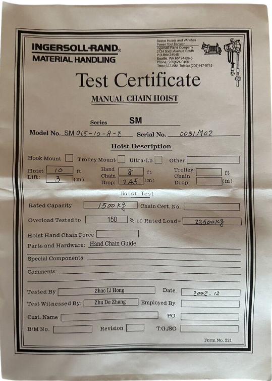 Paranco Manuale Ingersoll Rand - 1500kg, 3m