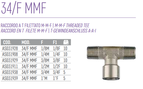 Descrizione: Il raccordo a T filettato maschio-maschio-femmina 34/F MMF è un componente essenziale per il collegamento di circuiti pneumatici, oleodinamici e idraulici. Questo raccordo a T è progettato per garantire una connessione sicura e affidabile tra tubi o componenti filettati.